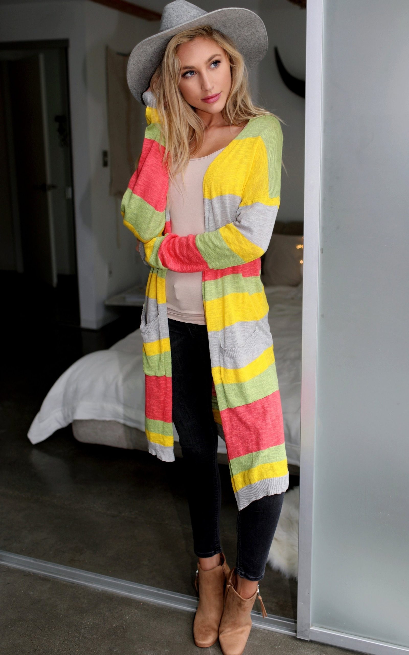 Lightweighted open-front cardigan in a vibrant, pop colored stripes.